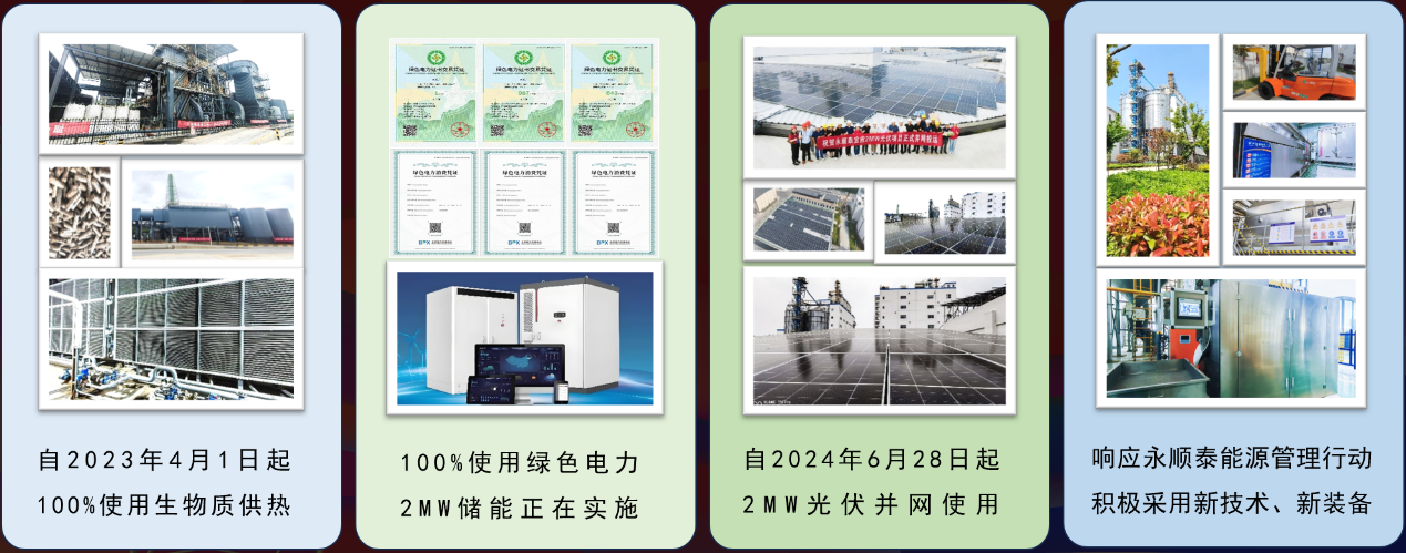 推動企業(yè)實現(xiàn)綠色能源轉(zhuǎn)型。永順泰積極探索發(fā)展綠色生產(chǎn)力,從優(yōu)化能源結(jié)構(gòu)、生產(chǎn)流程到提高資源利用效率,從加強環(huán)保設(shè)施建設(shè)到推廣綠色生產(chǎn)方式,致力為新質(zhì)生產(chǎn)力添加綠色動能。2024年以來,寶麥公司采用第三方能源合同管理模式,實現(xiàn)了100% 綠電使用和100%生物質(zhì)鍋爐供熱,并順利完成2MW光伏太陽能項目建設(shè)并網(wǎng)。淘汰柴油叉車,全部更換為電叉車;購置特種麥芽電磁焙炒爐,取代燃?xì)獗撼礌t;員工食堂全部采用綠電炊具廚具等,逐步推動企業(yè)實現(xiàn)綠色能源轉(zhuǎn)型。寶麥公司成立節(jié)水、節(jié)電、節(jié)汽等能耗攻關(guān)小組,運用六西格瑪統(tǒng)計分析方法實施PI過程能力改善,抓住各環(huán)節(jié)能耗改善機會點,制定減耗目標(biāo)和揭榜獎勵機制。今年以來,寶麥公司電、水、汽耗分別同比降低 17%、11%、16%,總采購能耗降幅為 15%,碳排放降低95%。